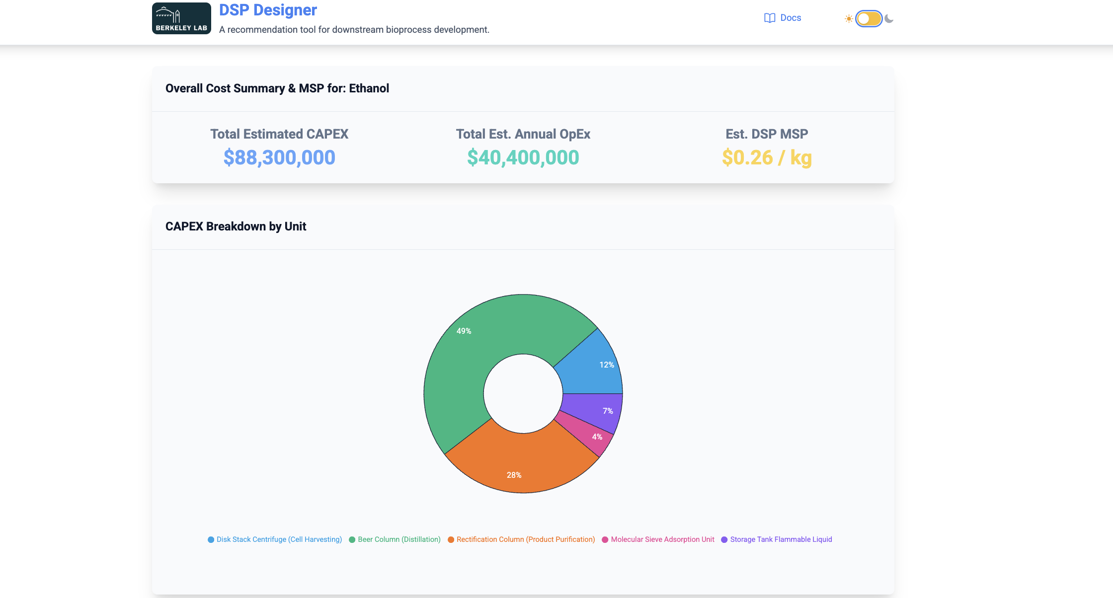 Decision support tool for determining equipment and costs for recovery process of biofuel/bioproduct production pathways.